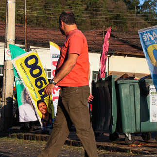 O ensaio fotográfico retrata o cenário urbano de Ouro Preto durante o período de campanha eleitoral para prefeito e vereadores. Antes mesmo do pôr do sol do dia 1º de outubro de 2024, entre os bairros do Pilar e da Barra, capturei cenas que refletiam cores, números e nomes diversos do microcosmo cotidiano da cidade. As fotos seguem a ordem do trajeto percorrido e destaca a presença de bandeiras de diferentes candidatos, com uns mais presentes que outros. Adesivos repetidos em um mesmo local e um excesso de cores, evidenciam a campanha de cada partido. Essa diversidade visual mostrou a intensa disputa eleitoral, pois parecia que cada espaço vazio era um território que precisava ser conquistado, como em filmes de guerra. Adesivos ocupavam monumentos, bandeiras impediam o fluxo de pedestres nas calçadas e até os postes e lixeiras não saíram imunes das propagandas eleitorais. A estética dominada por panos, plásticos e papeis também ressaltou a poluição visual gerada em uma cidade que respira história, mas que foi ofuscada pela luta por uma vaga na Prefeitura e na Câmara Municipal.